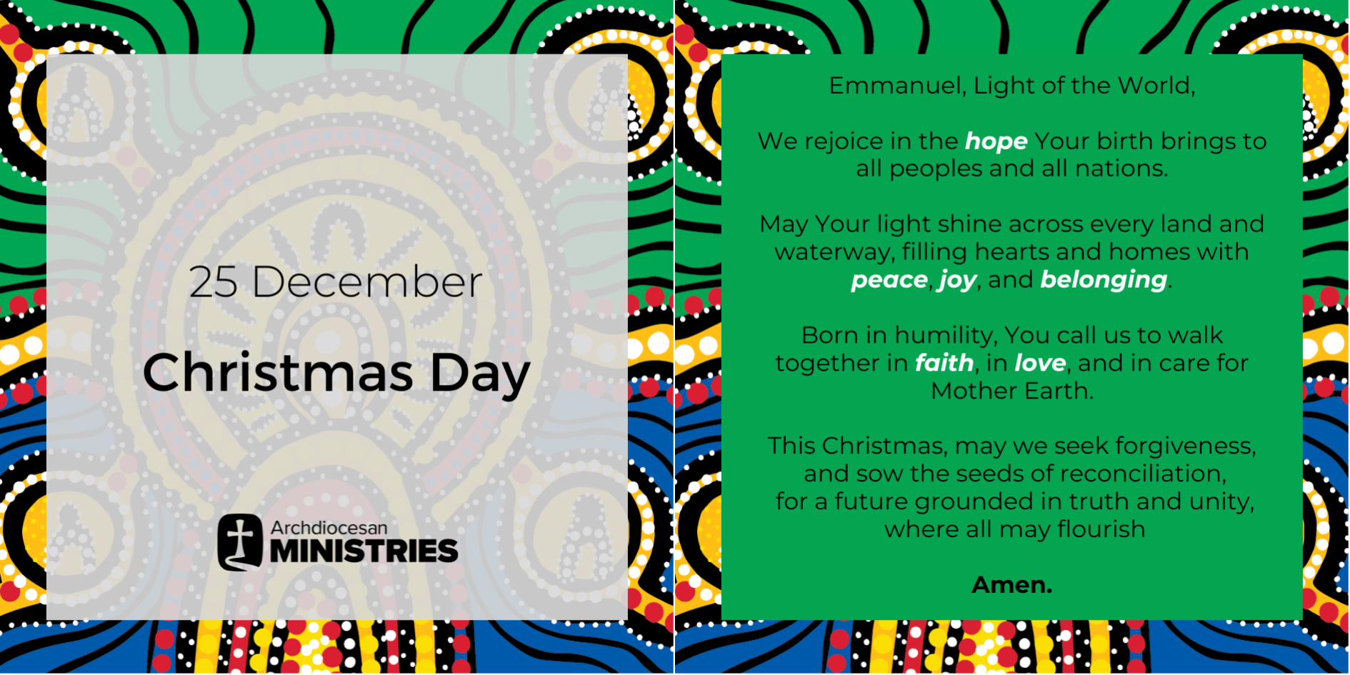 We respectfully acknowledge the Traditional Custodians of the Archdiocese of Brisbane, North, South, East and West and reflect on the millions of footprints that travelled the Dreaming pathways and continue to walk this land.